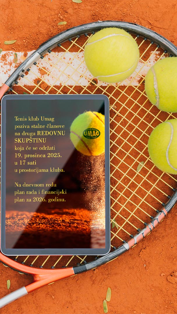 Tenis klub Umag poziva sve stalne članove na drugu redovnu skupštinu kluba, koja će se održati 19. prosinca 2025. godine u 17:00 sati u prostorijama kluba.