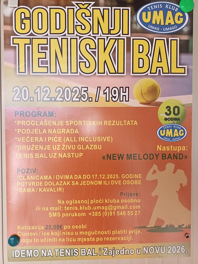 Tenis klub Umag vas poziva na godišnji teniski bal, koji će se održati 20. prosinca 2025. godine s početkom u 19 sati u restoranu "Bukaleta".