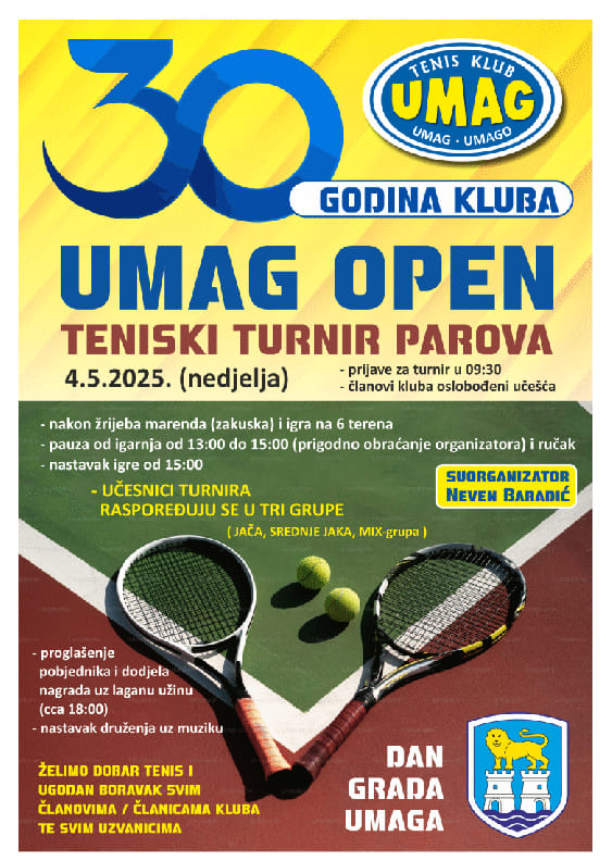 Tenis klub Umag ove nedjelje, 4. svibnja, poziva sve svoje članice i članove na proslavu 30. obljetnice kluba, koja će se održati u sklopu obilježavanja Dana grada Umaga.